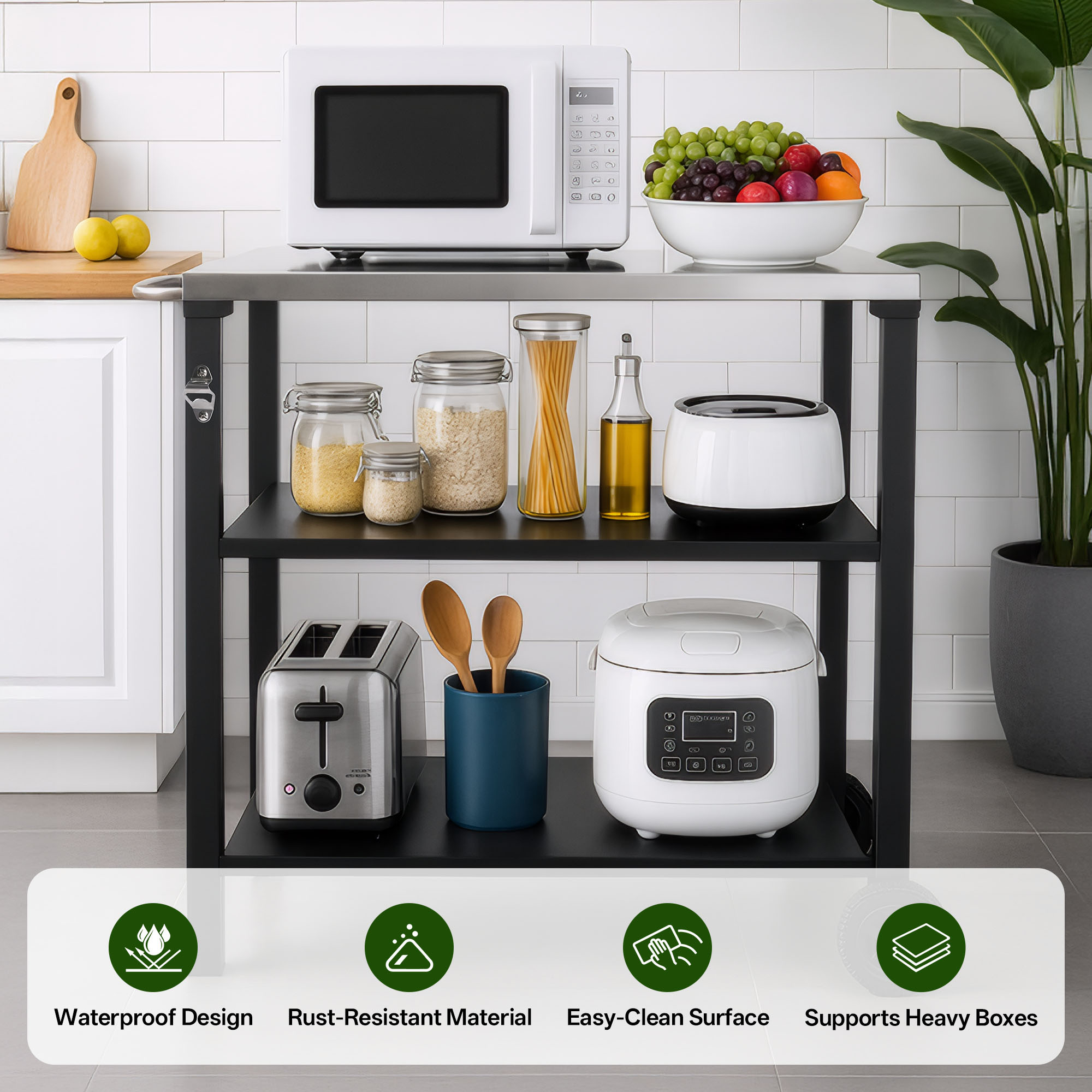 - Easy to Clean & MaintainThe smooth stainless steel top and powder-coated metal shelves are simple to wipe clean with a damp cloth, while the open-shelf design prevents dirt buildup, keeping your cart looking fresh and functional.