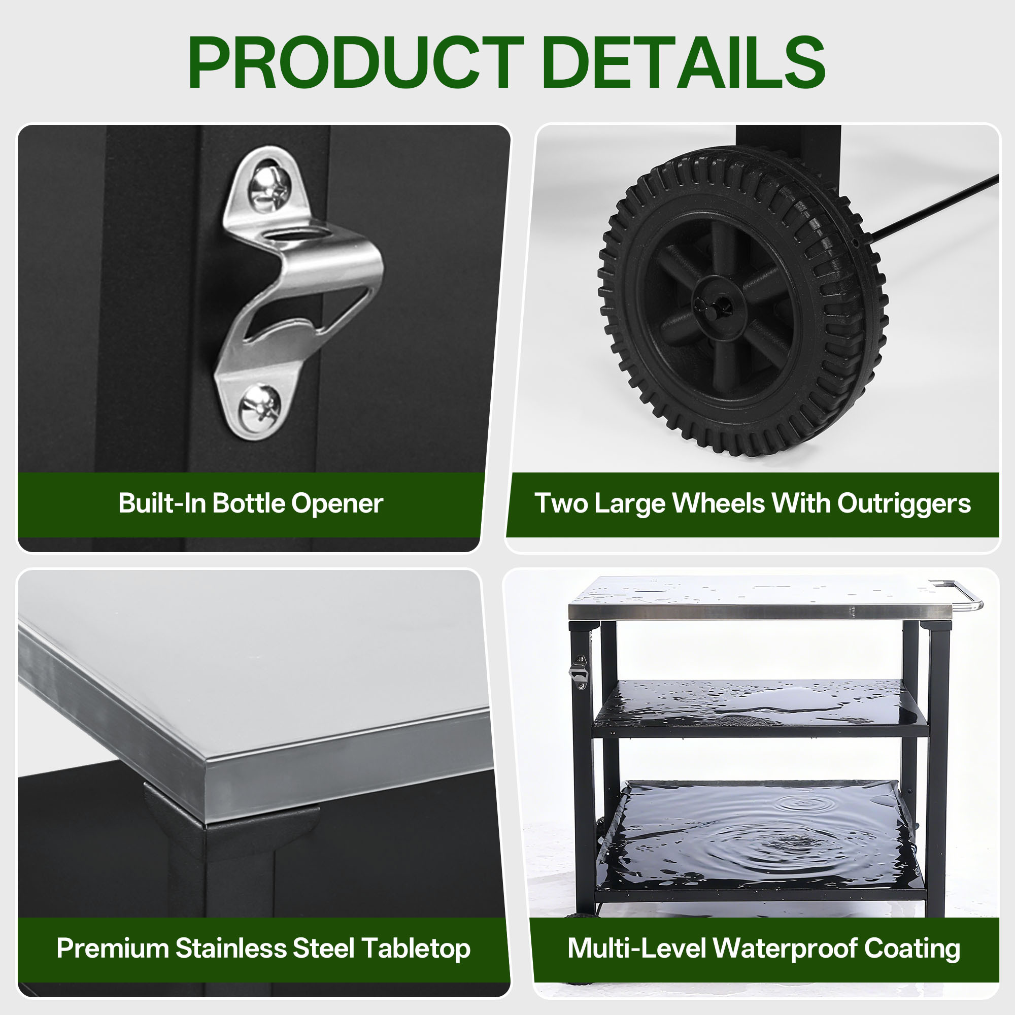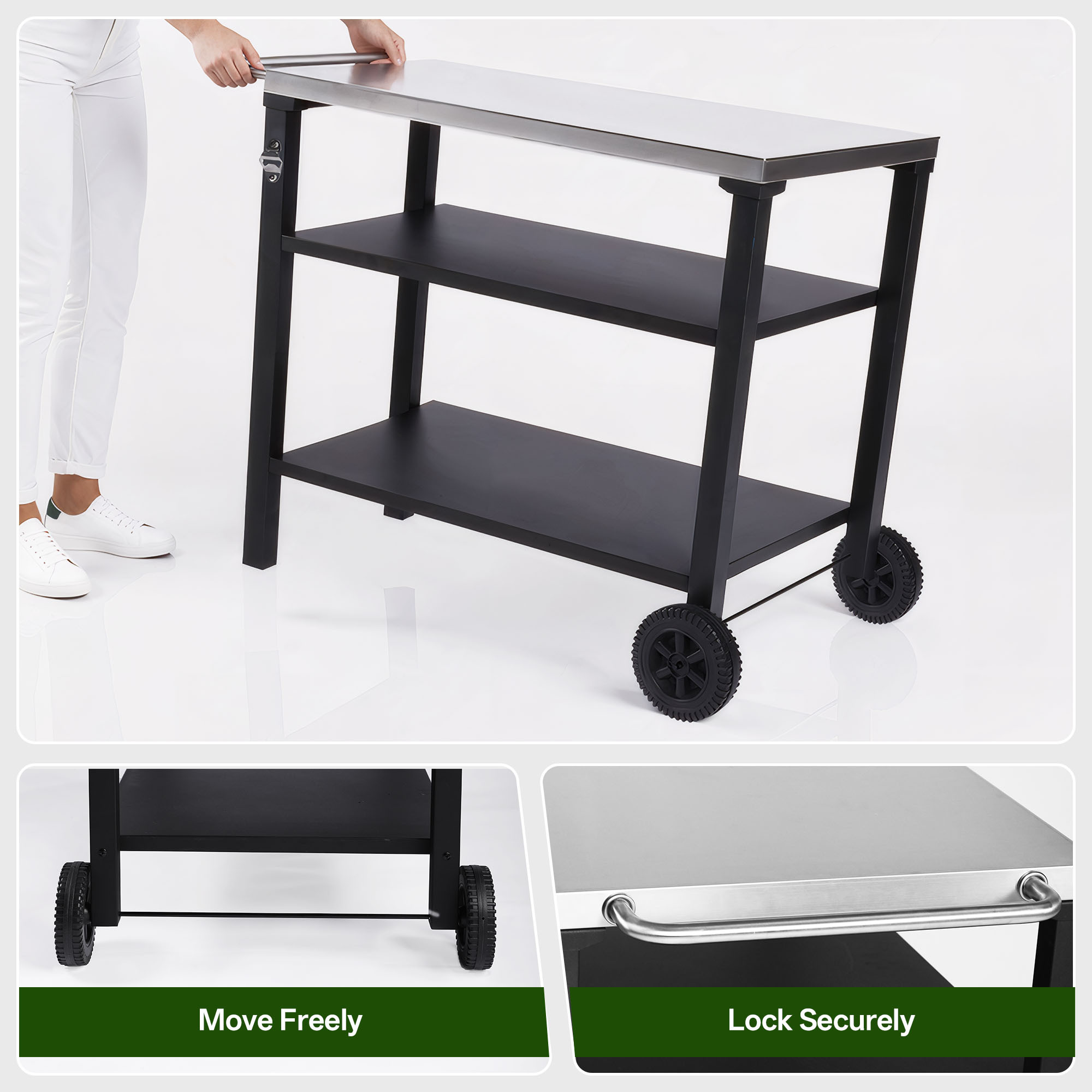 - Durable & Rust-Resistant ConstructionCrafted with a premium stainless steel tabletop and a heavy-duty black metal frame, this cart is built to withstand outdoor elements, resist rust, and ensure long-lasting durability for all your outdoor cooking and entertaining needs.