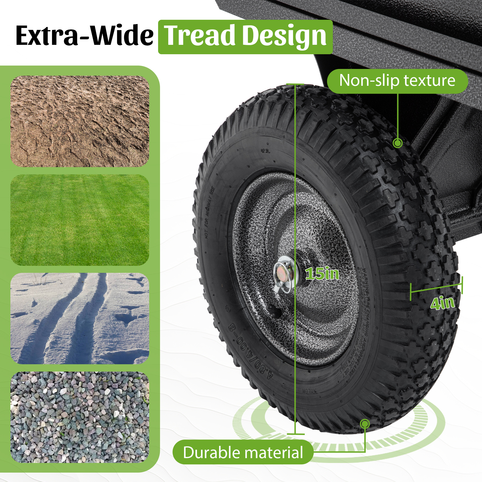 - 【All-Terrain Maneuverability】Conquer any landscape with large 15×4-inch pneumatic tires. They provide a smooth, stable ride and superior traction across challenging surfaces like soft lawns, muddy paths, and rough ground. A reinforced, powder-coated axle ensures lasting durability and reliable performance through years of use.