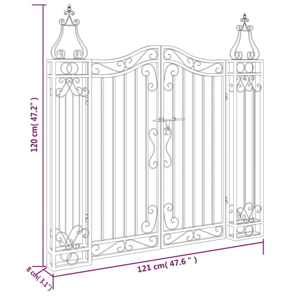This decorative garden gate with elegant wrought iron posts provides an ideal entrance to your garden or patio. Durable material: The gate is made of powder-coated wrought iron to ensure longevity. This gate is fully forged, making it stronger and heavier than most iron gates on the market. The gate comes complete with hinges for quick locking and mounting posts for easy installation.