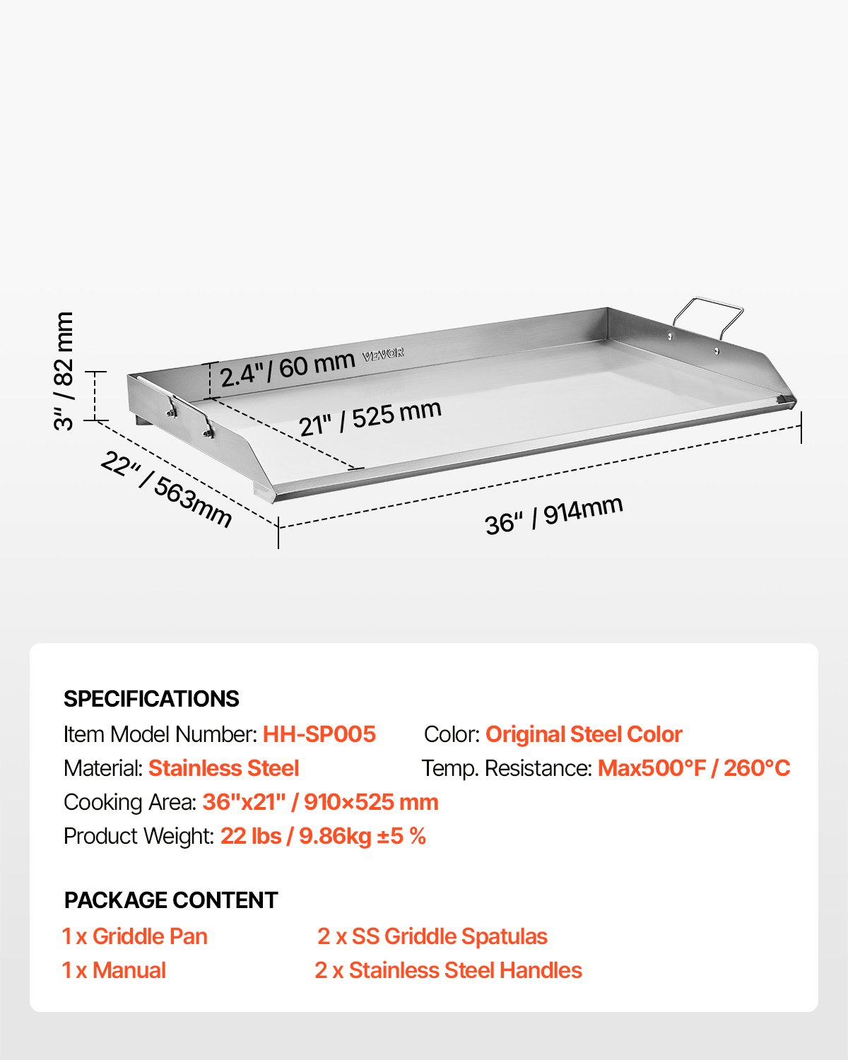 Farbe: Original Stahlfarbe,Kochbereich: 36 x 21 Zoll / 910 x 525 mm,Produktgewicht: 22 lbs / 9,86 kg ±5 %,Material: Edelstahl,Artikelmodellnummer: HH-SP005,Temperaturbeständigkeit: Max. 500 °F / 260 °C