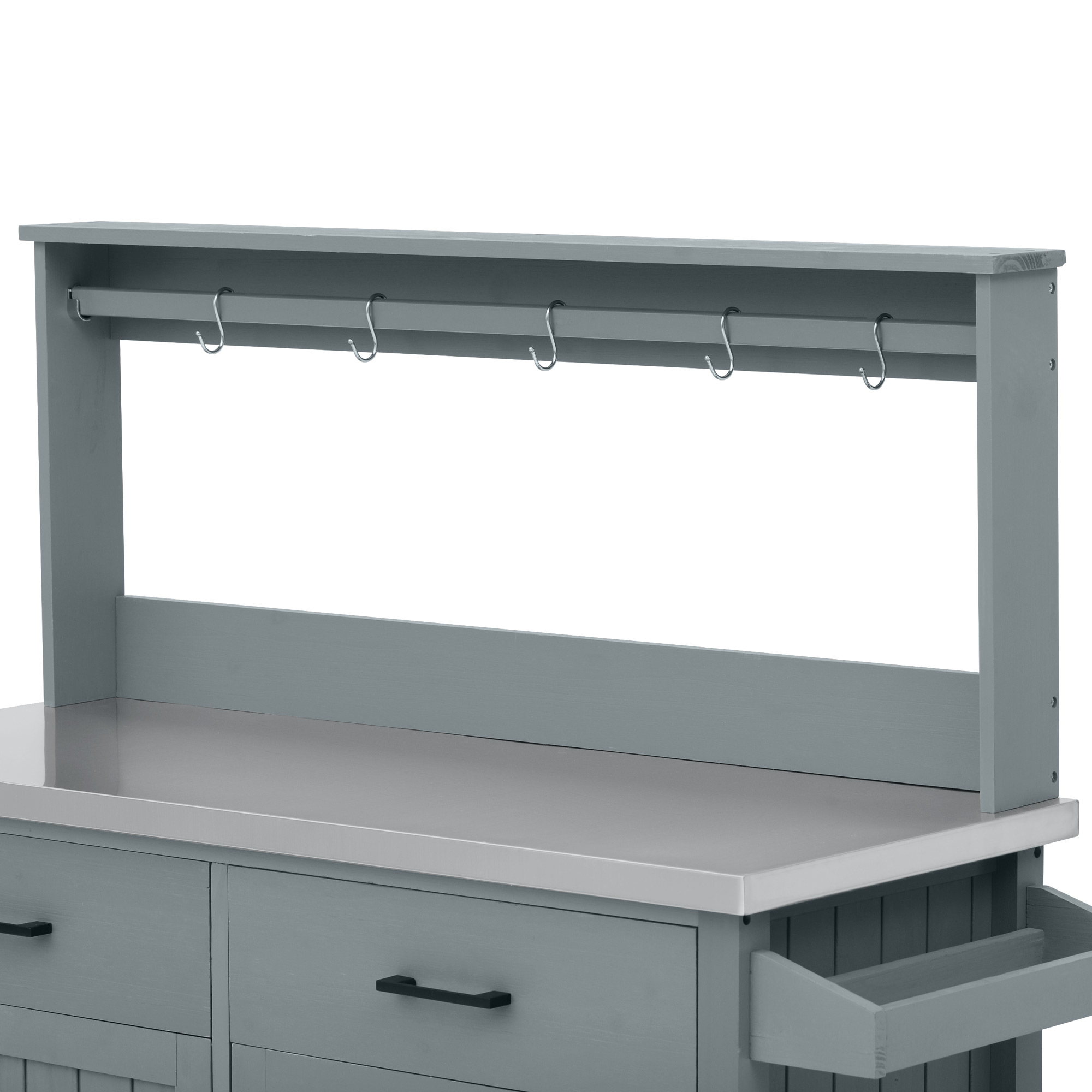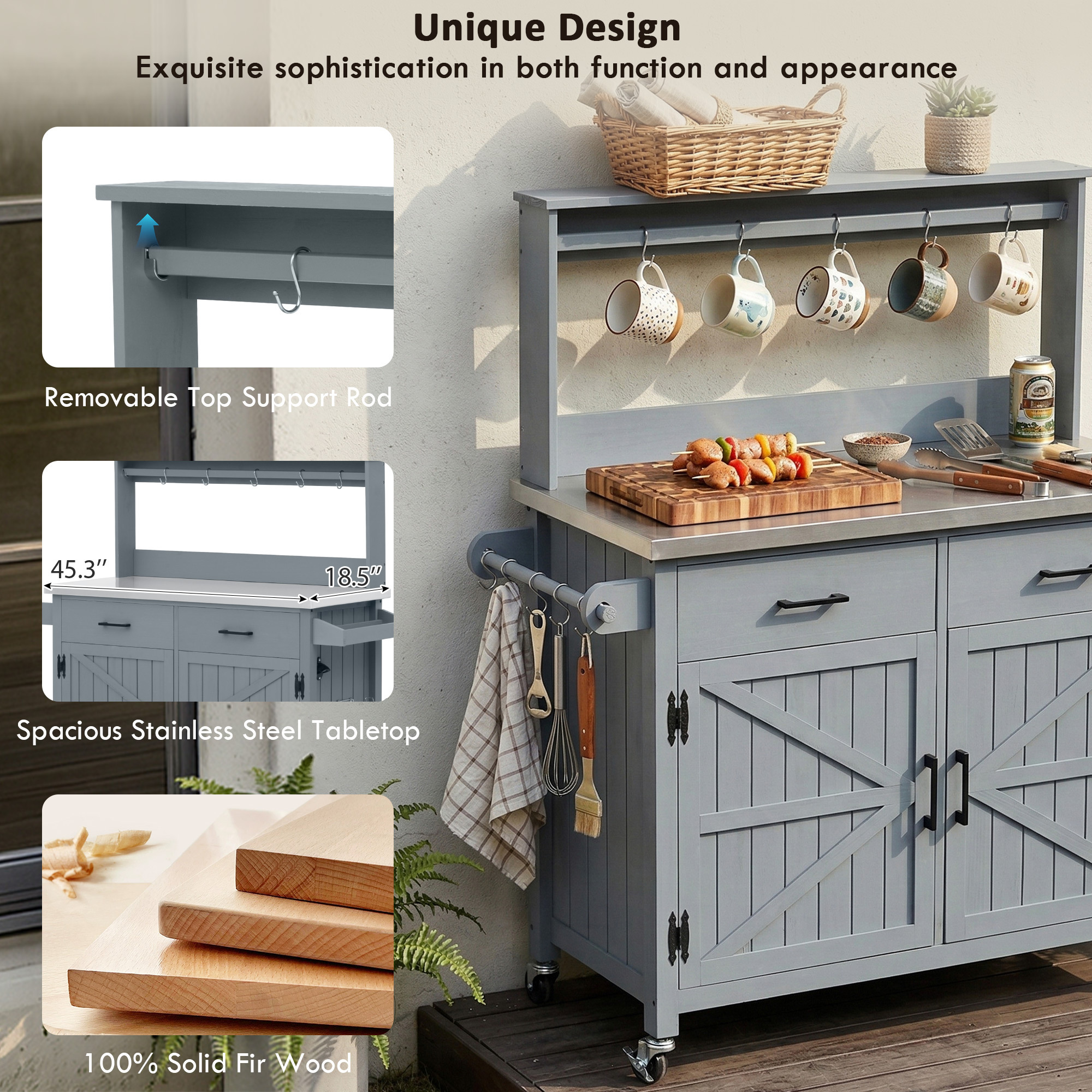 Special Feature:100% Solid Fir Wood/201 Stainless Steel Top/ High Shelf with Hooks