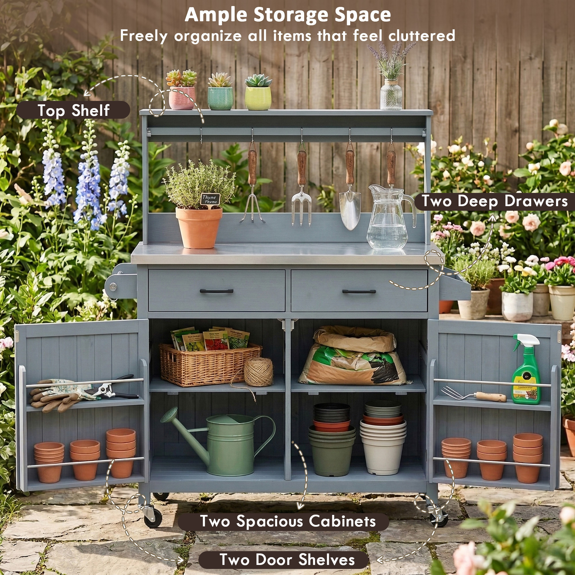 • [Ample Storage Space] This outdoor workbench will satisfy you with its size and storage capacity. Beyond its impressive height, it features a spacious 45.3″ × 18.5″ countertop. For storage, this unit includes two large drawers with handles and two spacious cabinets, accommodating any outdoor gardening tools, grilling equipment, and kitchenware. Towel racks and spice racks are also integrated into both sides of the cabinet, ensuring all your tools are within easy reach when you’re actively using
