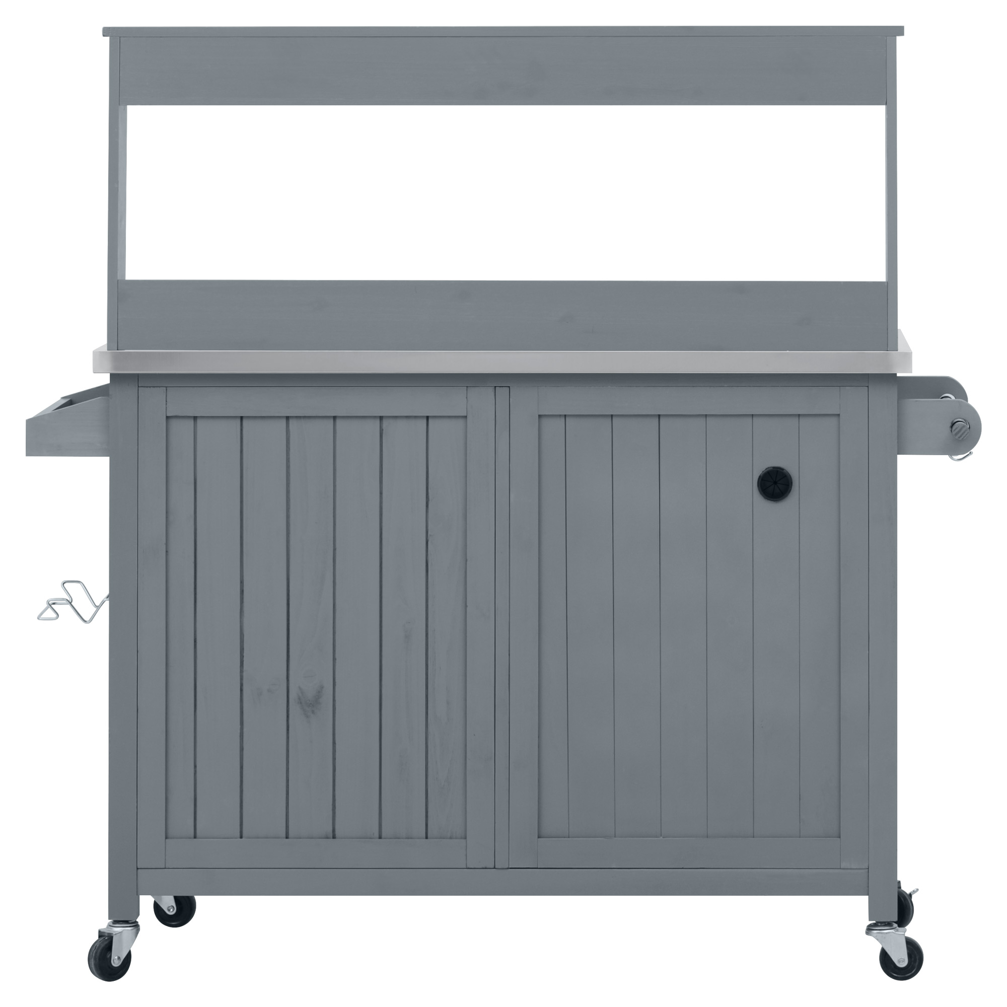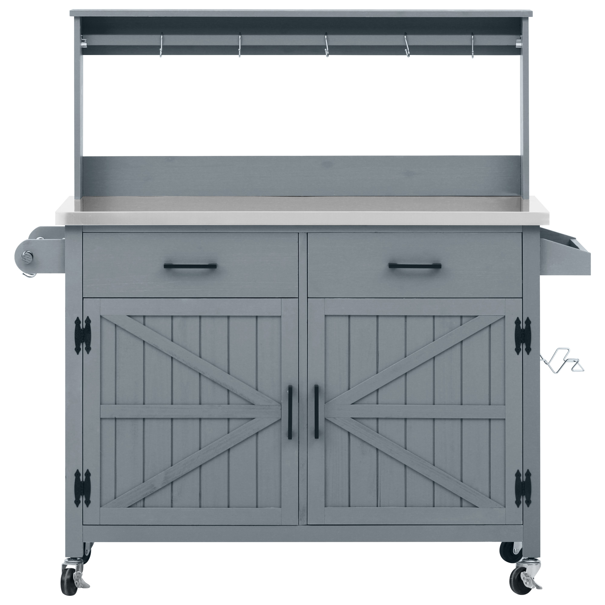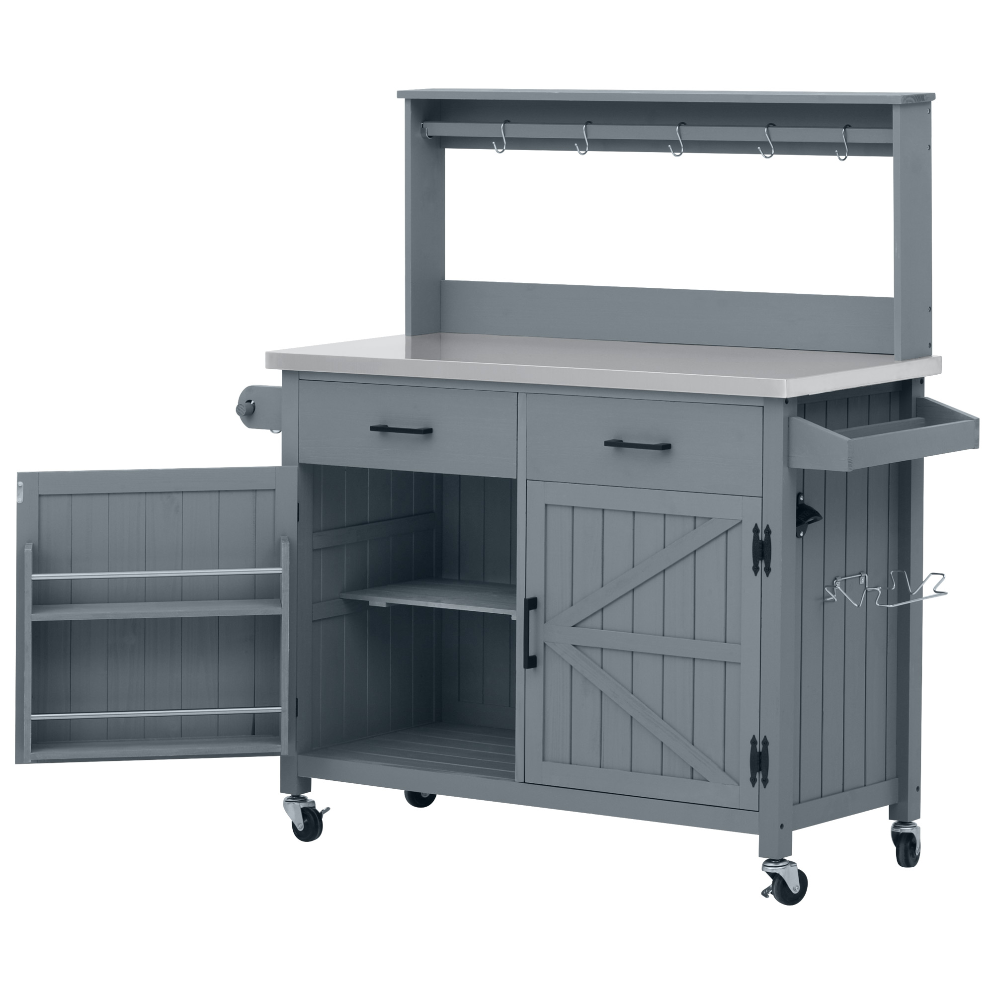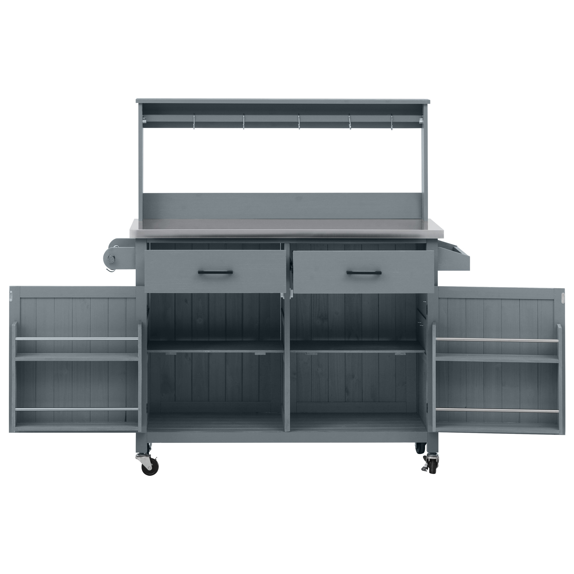 K&K 54.1 Outdoor Kitchen Island With High Shelf, Large Outdoor Potting Bench Table With Stainless Steel Top And Storage Cabinet, Solid Wood Grill Cart With Lockable Wheels For BBQ, Garden, Grey Blue