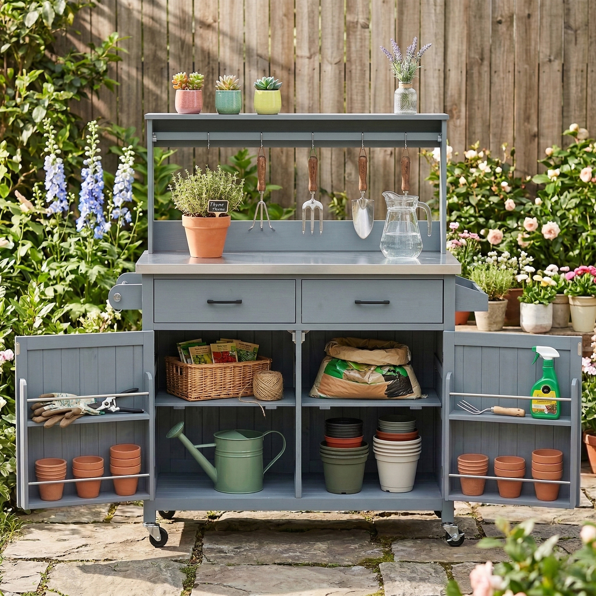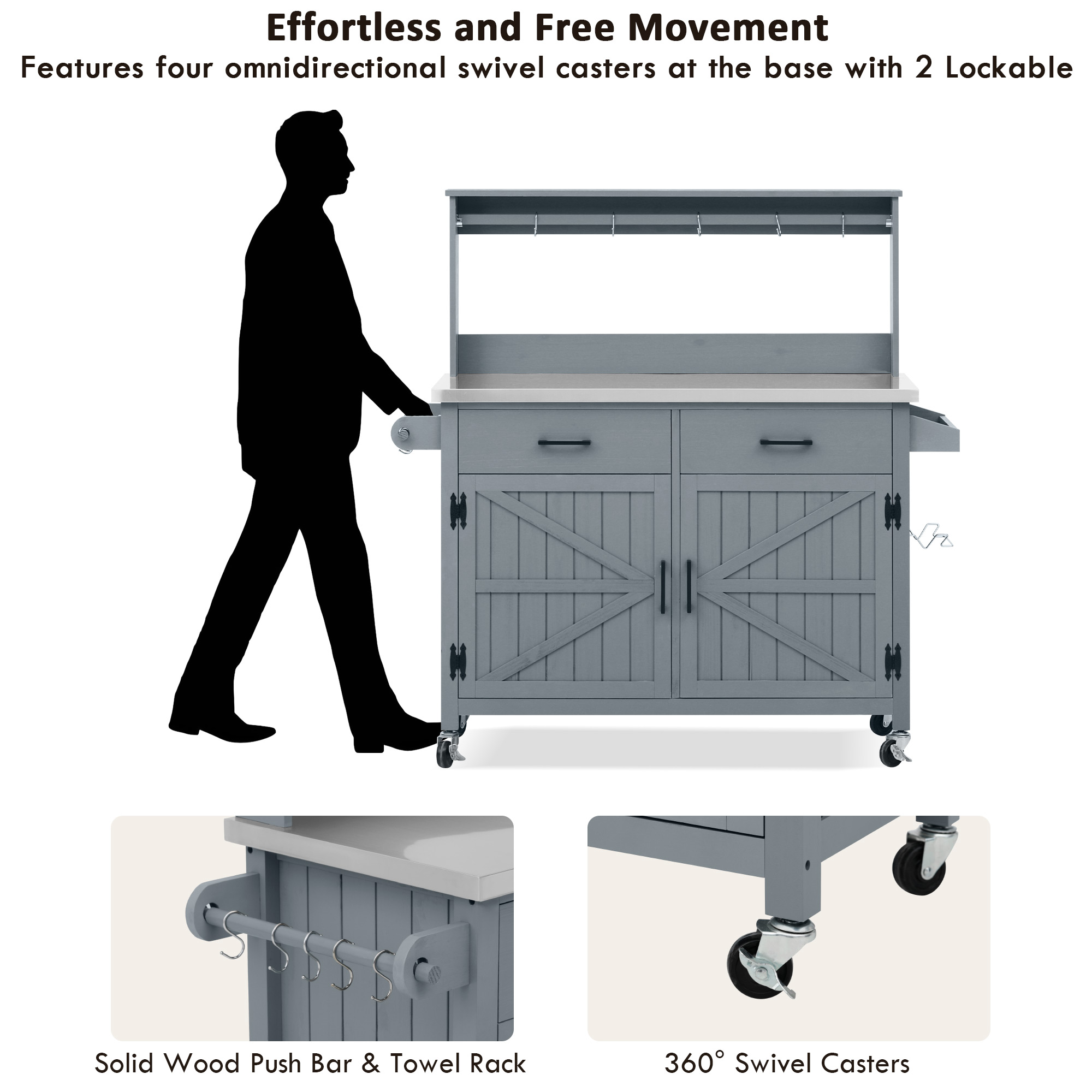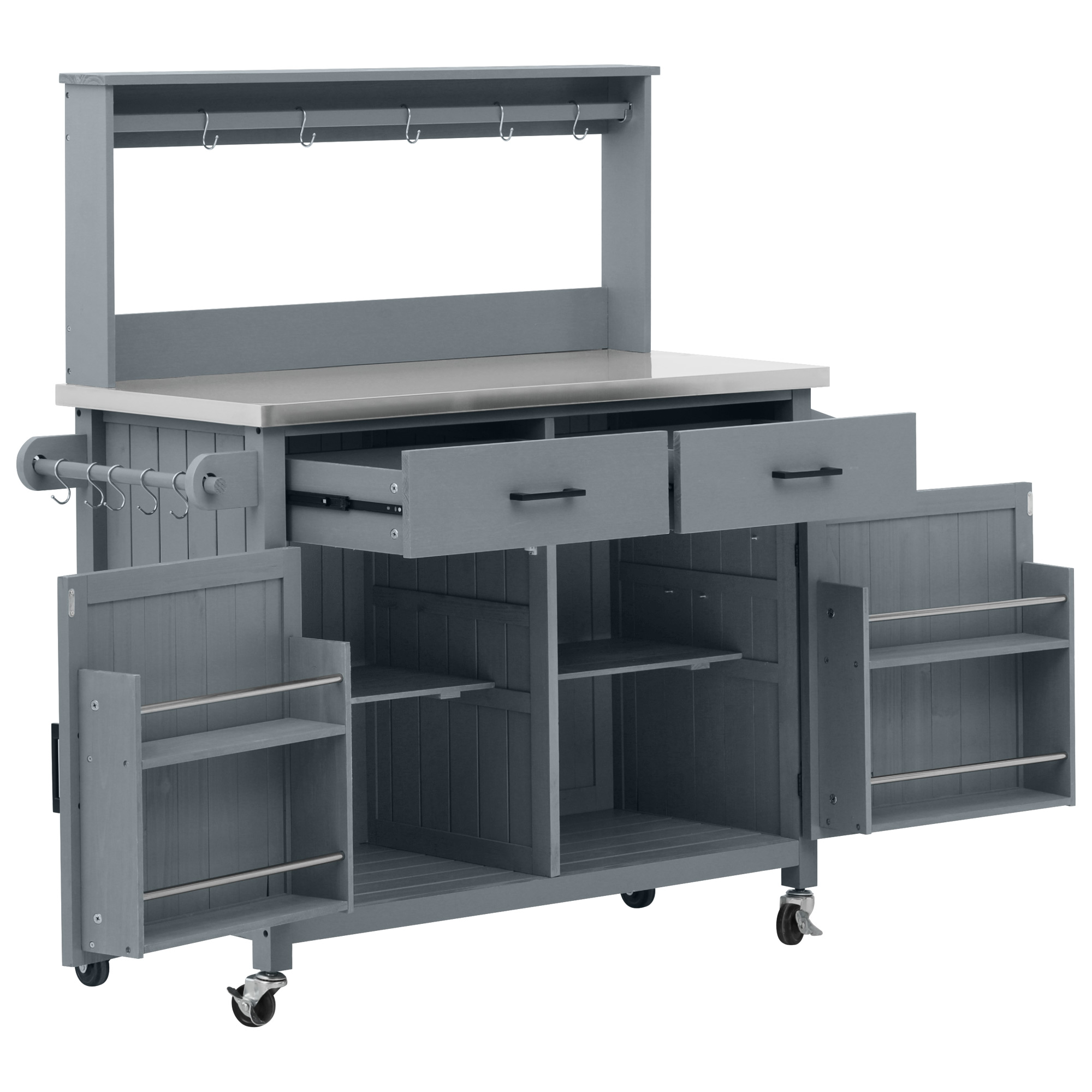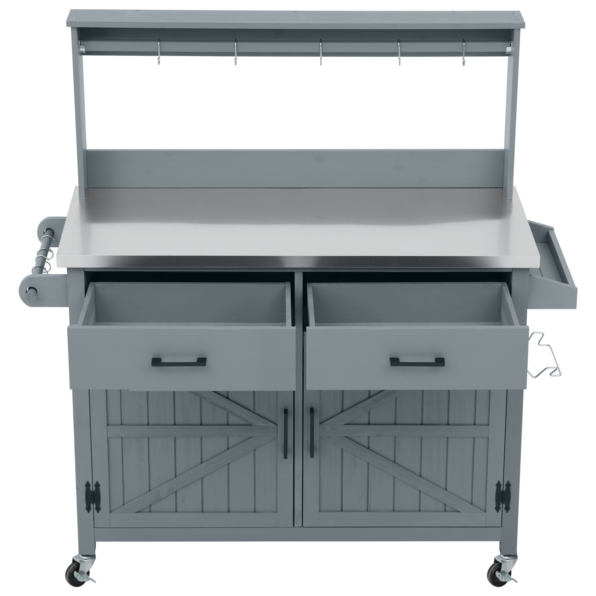 K&K 54.1 Outdoor Kitchen Island With High Shelf, Large Outdoor Potting Bench Table With Stainless Steel Top And Storage Cabinet, Solid Wood Grill Cart With Lockable Wheels For BBQ, Garden, Grey Blue