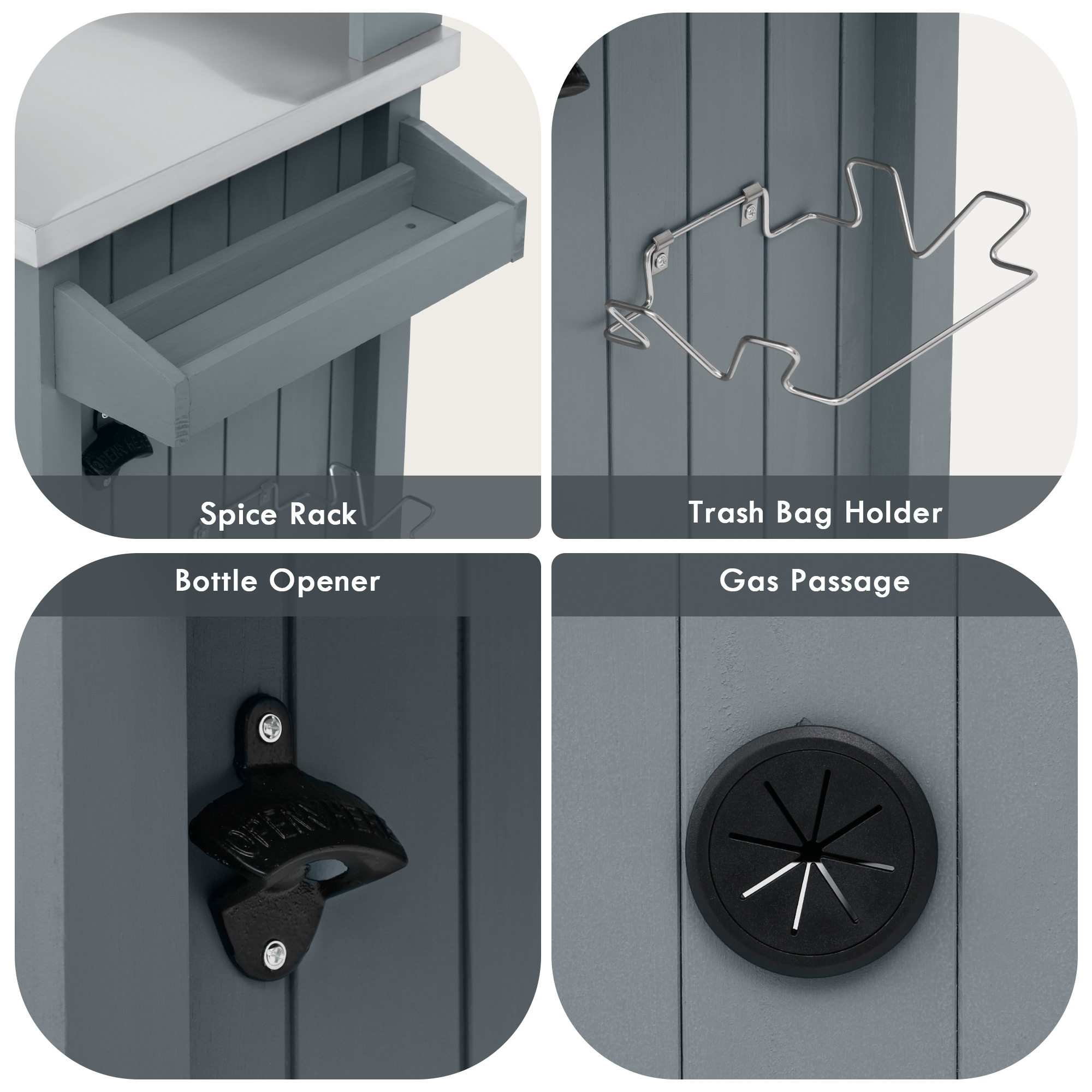 • [Internal Storage Racks] Our outdoor kitchen island features an internal storage rack design inspired by the functionality of refrigerator doors. The storage rack effectively optimizes storage capacity while occupying minimal space, making them an ideal addition to outdoor kitchens and dining areas.