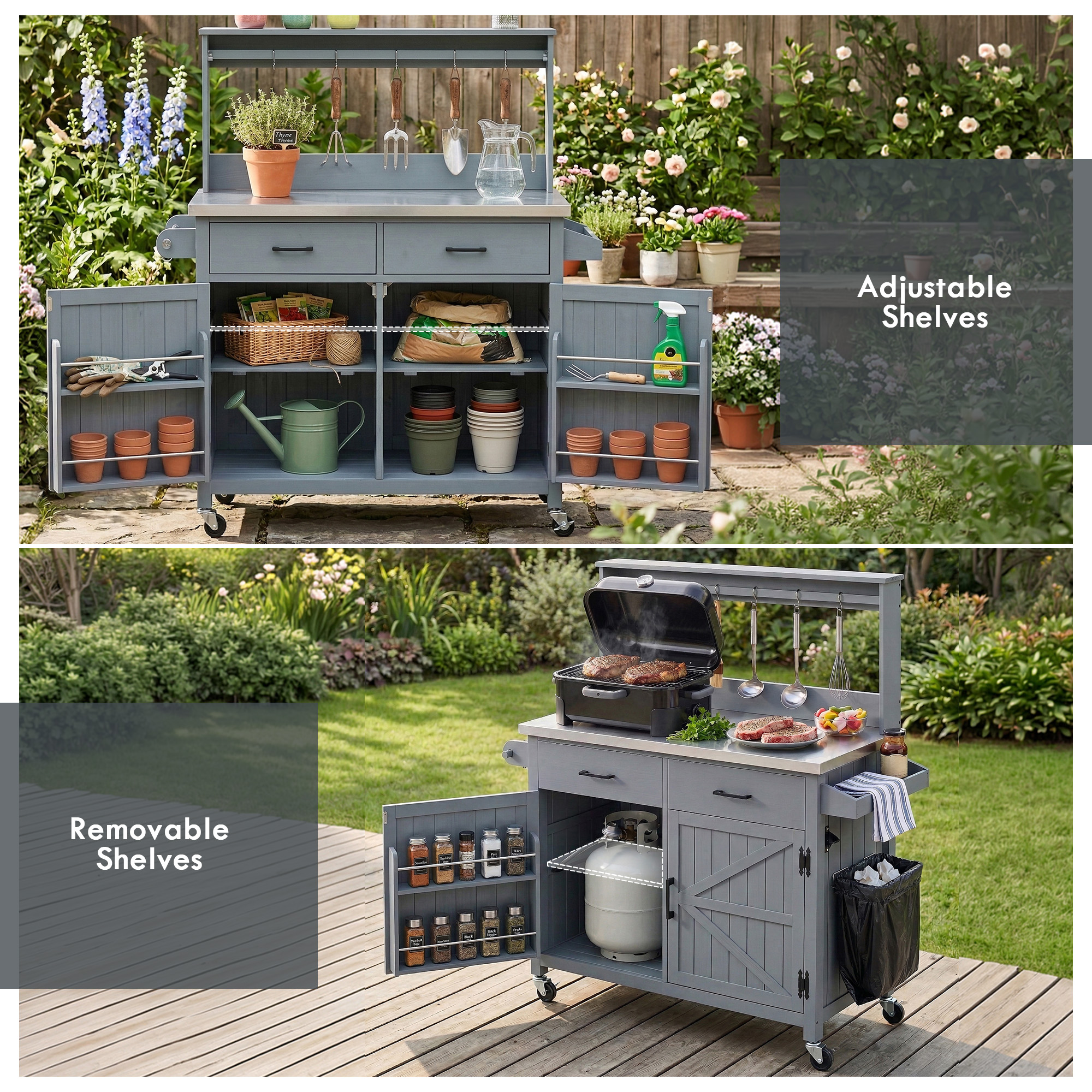• [Adjustable&Removable Shelves] The up and down adjustable shelves can hold cookware or outdoor tools at different heights. On top of that, they can also be removed. This allows the shelf to be removed for placing propane cylinders suitable for outdoor grilling. For this purpose, a special gas channel is reserved in the right cabinet.