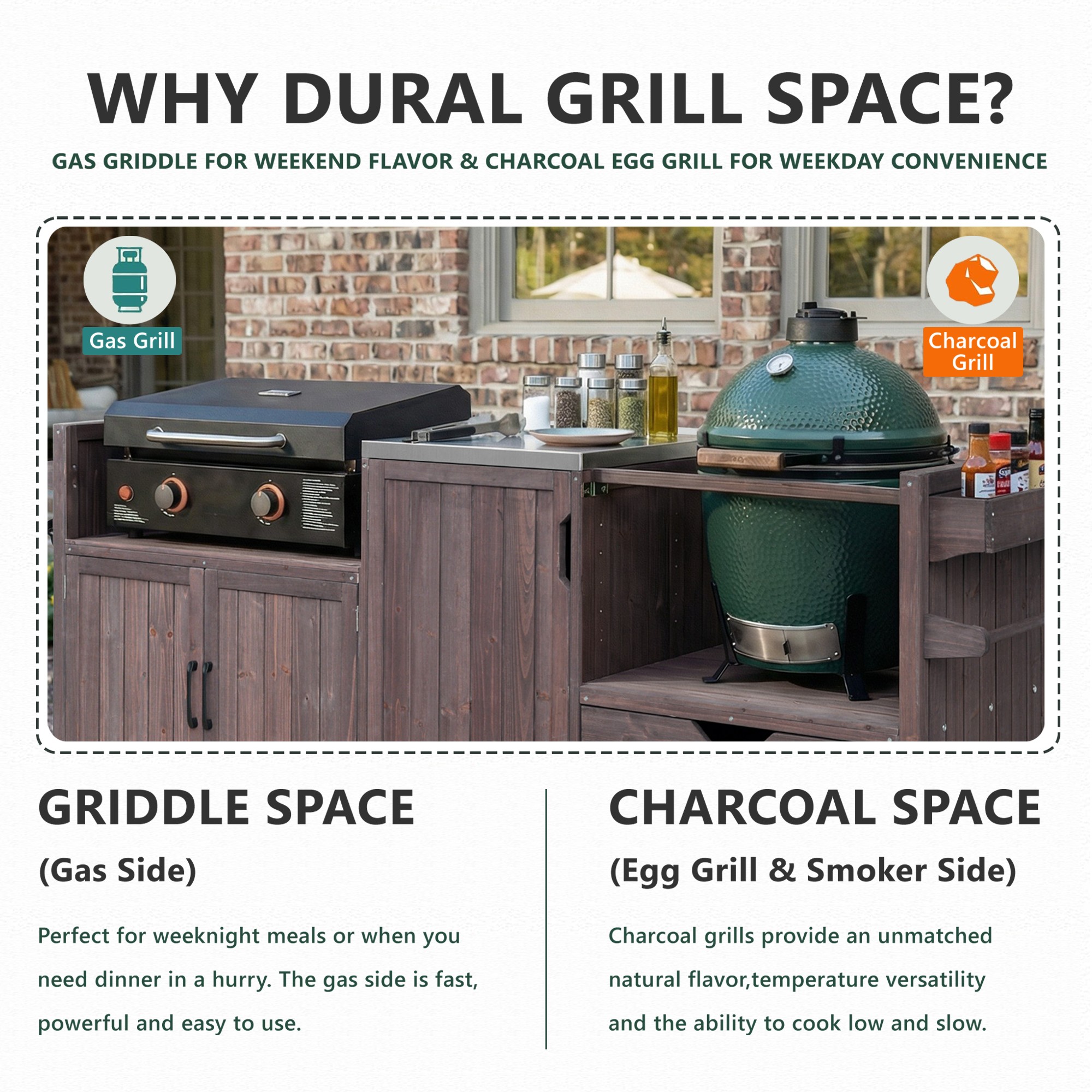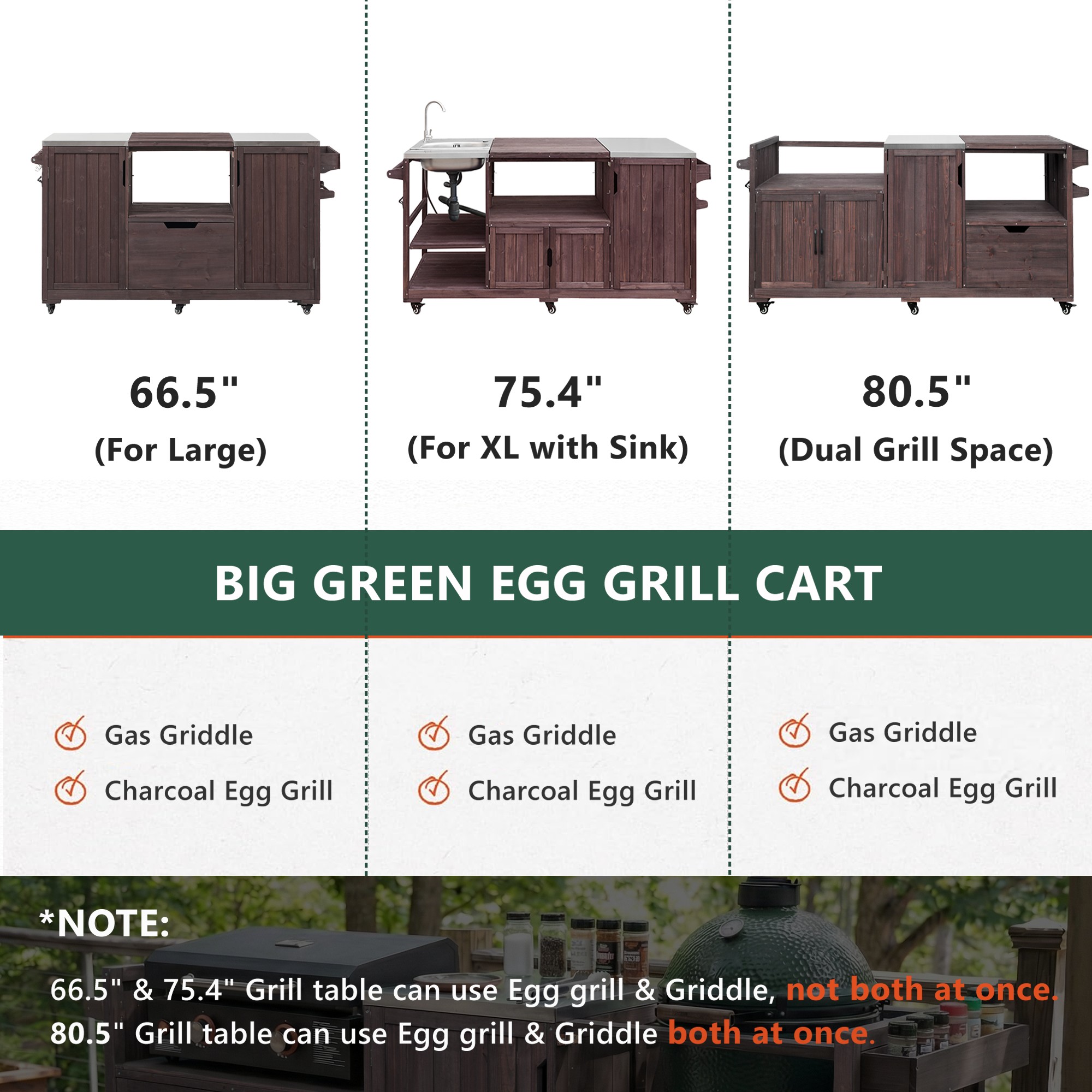 | Summary | Bring order, function, and serious grilling power to your backyard setup. This all-in-one grill cart is designed to house both a Large Big Green Egg and a Blackstone griddle—either the 22 or 28 inch version, giving backyard chefs the flexibility to smoke, sear, and griddle in one central station. The Solid fir wood frame is paired with a sleek stainless steel worktop, forming a strong, unified grilling surface that feels like a permanent outdoor kitchen. It’s not just for the Big Green Egg. This table also fits Kamado Joe 18-inch Classic, Primo Kamado, and other similar models (please check size compatibility). Storage is where this unit truly shines. The outdoor grill cart features a spacious side drawer, an 18.5” x 24” stainless steel table, and two cabinets with 2 adjustable & removable shelves. By placing the right adjustable table on top, you can connect them to create a large 41.3” x 24” table with a total work area of 991 sq inches, ideal for any outdoor use. |